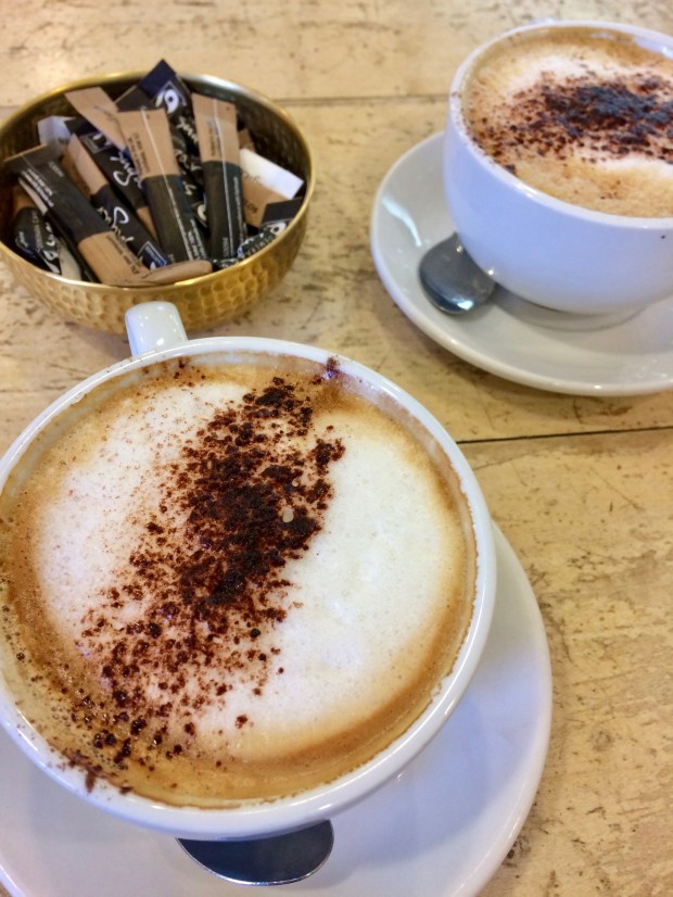 And inside the little café they serve us two warm cappuccinos. We settle back to take in the view, the only two there.