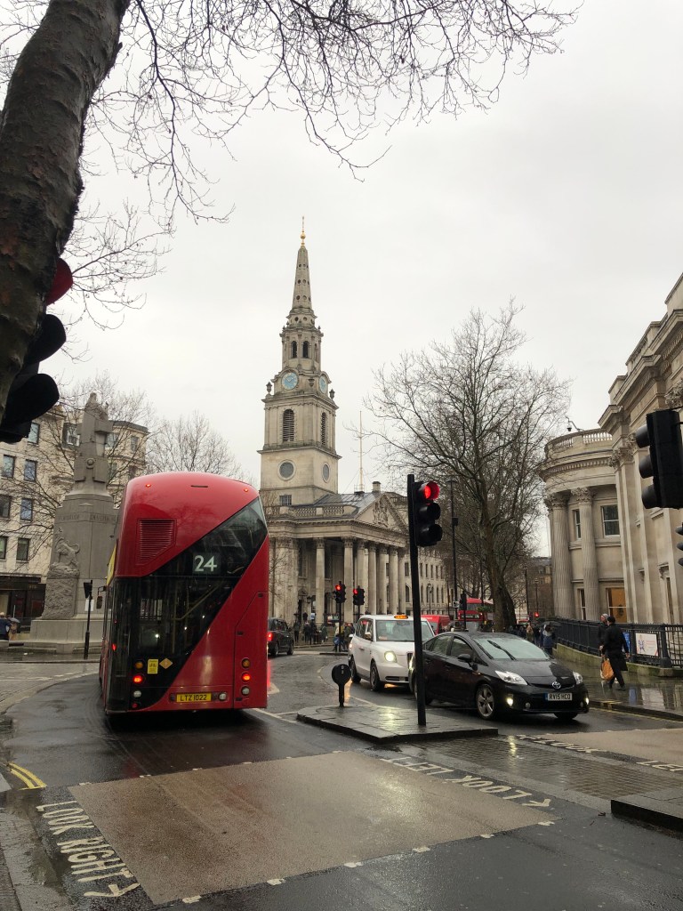 Paying the bill, I wandered slowly but with purpose through the rain, from Cork & Bottle along Charing Cross Road, cutting down the side of Trafalgar Square and past St Martin-in-the-Fields, where I have performed a few times and thus have many happy memories, taking pictures on the steps.